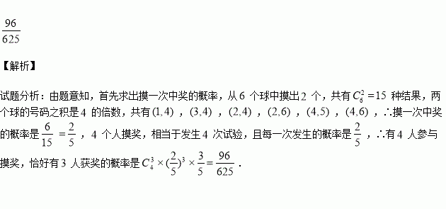 箱中装有标号为1,2,3,4,5,6且大小相同的6个球,从箱中一次摸出两个球,记下号码并放回,如果两球号码之积是4的倍数,则获奖.现有4人参与摸奖,恰好有3人获奖的概率是_________.