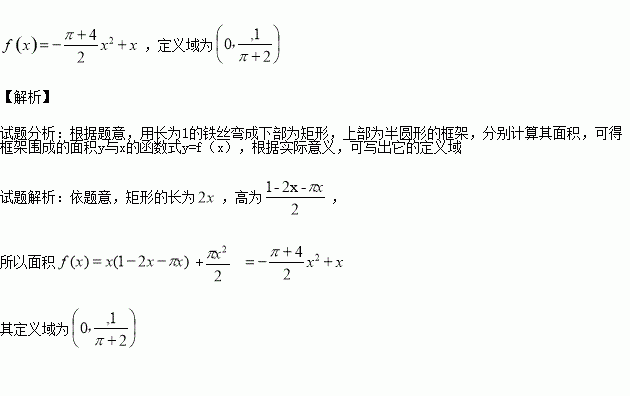 如图,用长为1的铁丝弯成下部为矩形,上部为半圆形的框架,若半圆半径为x,求此框架围成的面积y与x的函数式y=f (x),并求出定义域。