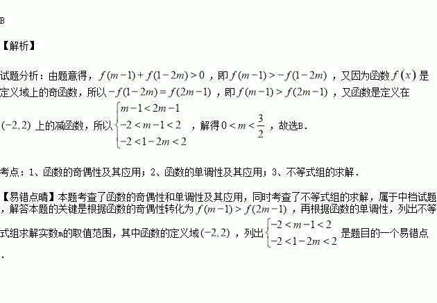 已知奇函数f(x)是定义在(-2,2)上的减函数,若f(m-1)+f(1-2m)>0,则实数m取值范围为( )