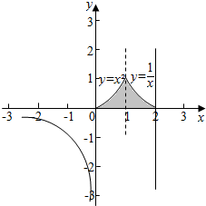 其面积为S=${∫}_{0}^{1}$x2dx+${∫}_{1}^{2}$$\frac{1}{x}$dx=$\frac{1}{3}{x}^{3}$|${\;}_{0}^{1}$+lnx|${\;}_{1}^{2}$=$\frac{1}{3}$+ln2,