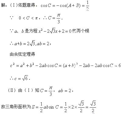 在△中,角、、所对的边分别为、、,,且满足 、是方程的两根。(I) 求角的大小和边的长度; (Ⅱ)求△的面积。