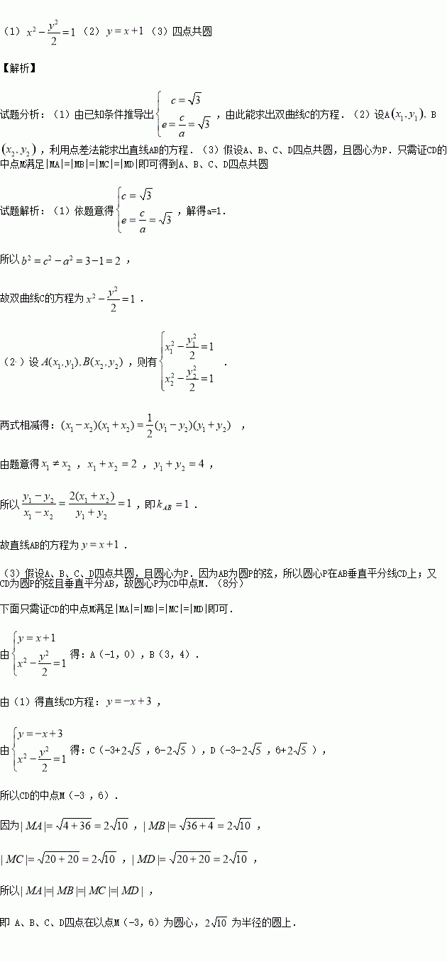 (3)如果线段AB的垂直平分线与双曲线交于C、D两点,那么A、B、C、D四点是否共圆?为什么?