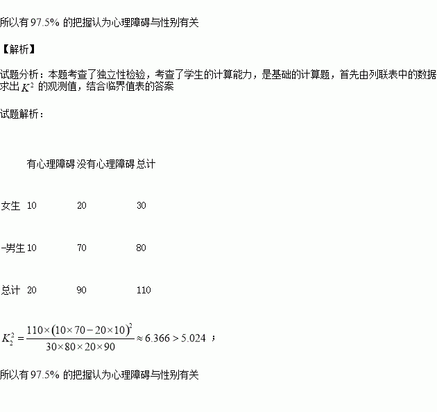 将表格填写完整,试说明心理障碍与性别的关系?![]()