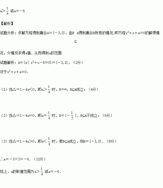 (10分)若集合A={x|x2+x-6=0},B={x|x2+x+a=0},且B⊆A,求实数a的取值范围.