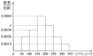 (2015•聊城二模)利用简单随机抽样从某小区抽取100户居民进行月用电量调查,发现其用电量都在50到350度之间,频率分布直方图如图所示.在这些用户中,用电量落在区间[150,250]内的户数为( )