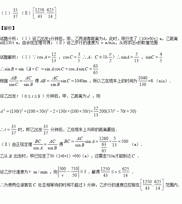 如图,游客从某旅游景区的景点A处下山至C处有两种路径.一种是从A沿直线步行到C,另一种是先从A沿索道乘缆车到B,然后从B沿直线步行到C.现有甲、乙两位游客从A处下山,甲沿AC匀速步行,速度为50m/min.在甲出发2min后,乙从A乘缆车到B,在B处停留1min后,再从B匀速步行到C.假设缆车匀速直线运动的速度为130m/min,山路AC长为1260m,经测量,