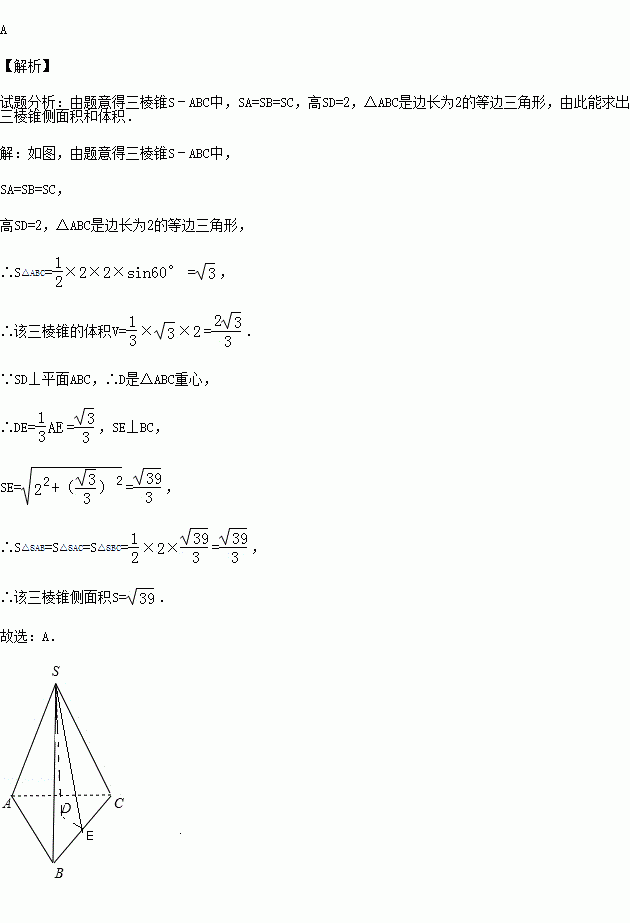 (2015秋•枣庄校级月考)一个三棱锥的侧棱长都相等,底面是正三角形,其正(主)视图如右图所示.该三棱锥侧面积和体积分别是( )