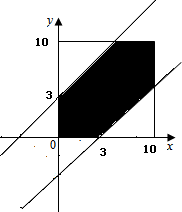 则该事件即为x-y=3和y-x=3在0≤x≤10,0≤y≤10的正方形中围起来的图形,![]()