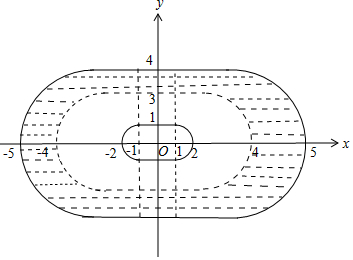 (2)画出点集S={P|2<d(P,l)≤3}所表示图形,分|x|≤1的部分与|x|>1的部分求出图形面积,作和得答案;