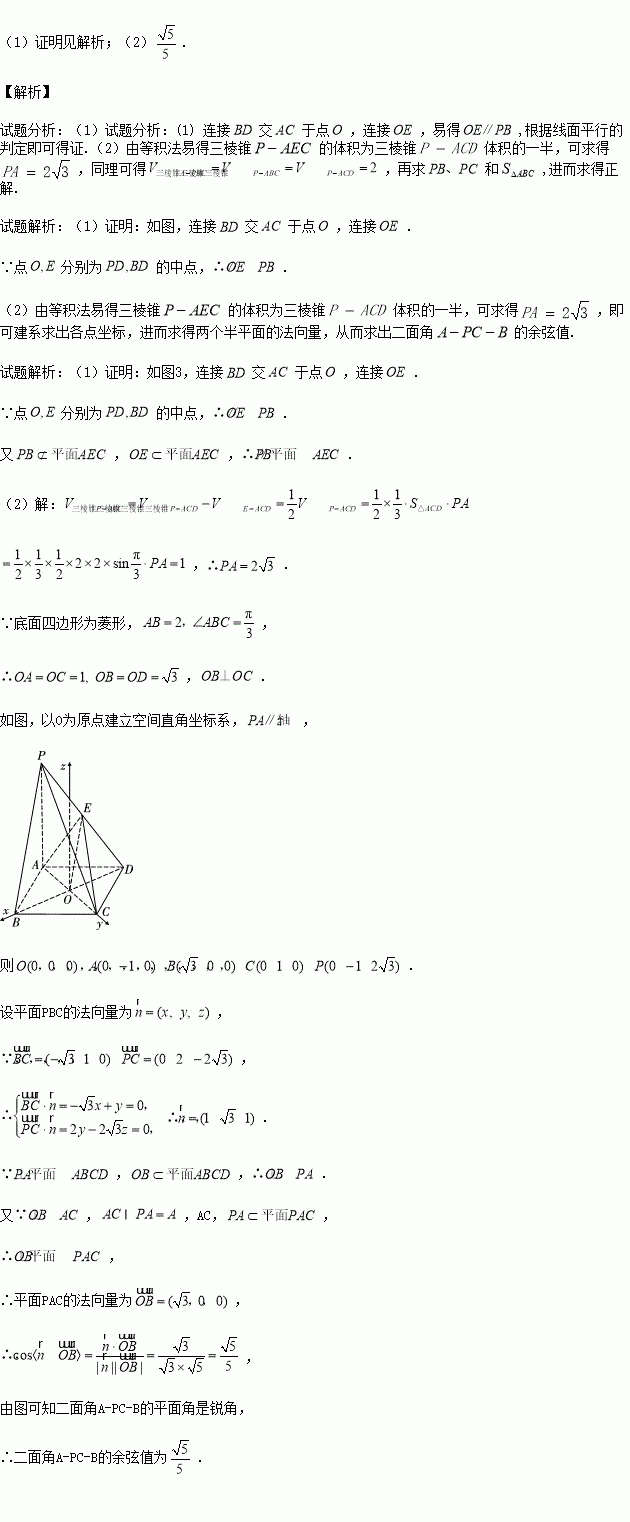 如图,在底面为菱形的四棱锥中,平面,为的中点,,.