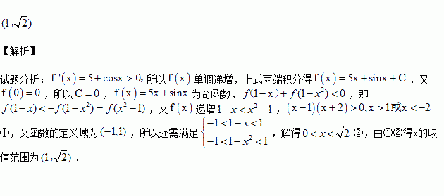 已知函数f(x)的导函数为f ′(x)=5+cosx,x∈(-1,1),且f(0)=0,如果f(1-x)+