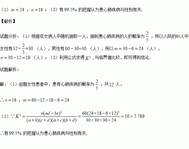 为了解某市心肺疾病是否与性别有关,在某医院随机的对入院的60人进行了问卷调查,得到如下列联表: