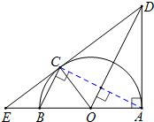 分析 (Ⅰ)要证DE是圆O的切线,连接AC,只需证出∠DAO=90°,由BC∥OD⇒OD⊥AC,则OD是AC的中垂线.通过△AOC,△BOC均为等腰三角形,即可证得∠DAO=90°.