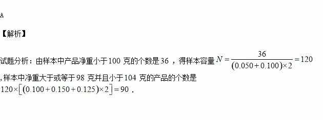 某工厂对一批产品进行了抽样检测.如图是根据抽样检测后的产品净重(单位:克)数据绘制的频率分布直方图,其中产品净重的范围是[96,106],样本数据分组为[96,98),[98,100),[100,102),[102,104),[104,106],已知样本中产品净重小于100克的个数是36,则样本中净重大于或等于98克并且小于104克的产品的个数是( )