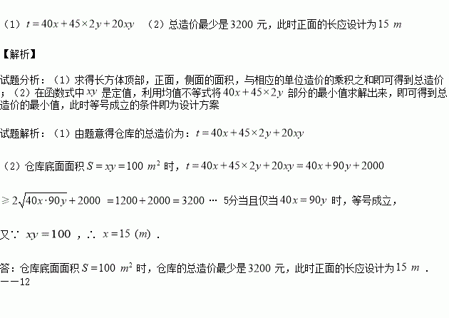 (本小题满分12分)某单位计划建一长方体状的仓库,底面如图,高度为定值.仓库的后墙和底部不花钱,正面的造价为40元