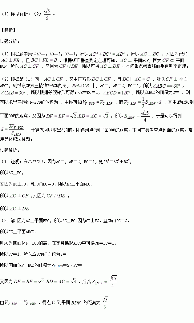 如图所示的几何体中,四边形CDEF为正方形,四边形ABCD为等腰梯形,AB∥CD,AC=,AB=2BC=2,AC⊥FB.