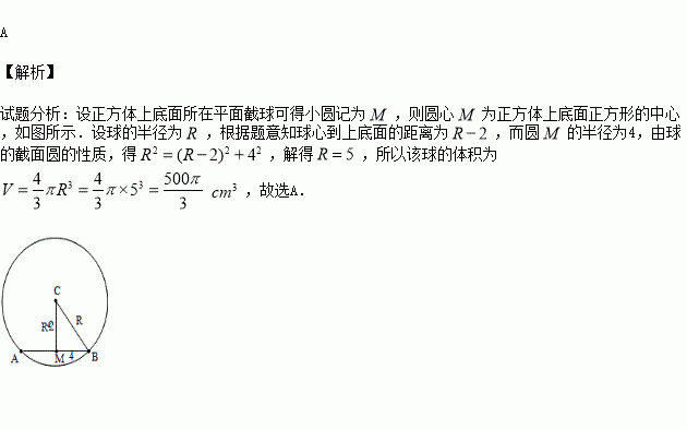 如图,有一个水平放置的透明无盖的正方体容器,容器高8cm,将一个球放在容器口,再向容器内注水,当球面恰好接触水面时测得水深为6c,如果不计容器的厚,则球的体积为( )