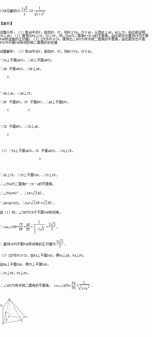 ⑶若AB=kPA,求平面PCD与平面PAB所成的锐二面角的余弦值.