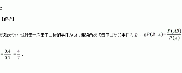 某射击手射击一次击中目标的概率为0.7,连续两次均击中目标的概率是0.4,已知某次射击中,则最后一次射中的概率是( )