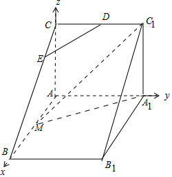 分析 (1)以A为原点,分别以AB,AA1,AC所在直线为x,y,z轴,建立如图所示空间直角坐标系,由已知求得所用点的坐标,求出平面A1MC1的一个法向量$\overrightarrow{n}$,再设$\frac{BE}{EC}=λ$,把$\overrightarrow{DE}$用含有λ的坐标表示,结合$\overrightarrow{DE}•\vec n=0$列式求得λ;
