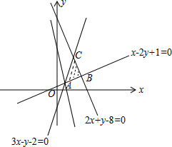 解答 解:由约束条件$\left\{\begin{array}{l}{3x-2y-2≥0}\\{x-2y+1≤0}\\{2x+y-8≤0}\end{array}\right.$作出可行域如图,![]()