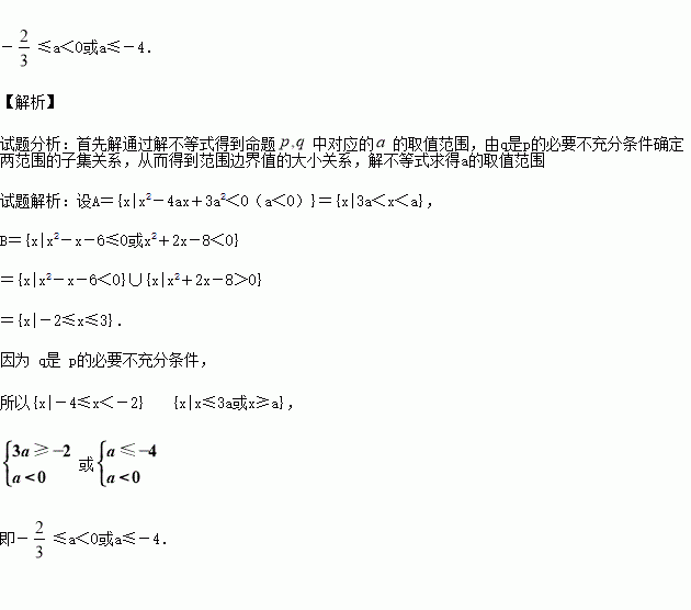 满足x2-4ax+3a2<0,其中a<0,命题q:实数x满足x2-x-6≤0,且q是p的必要不充分条件,求a的取值范围.