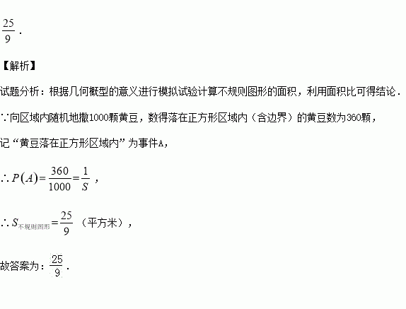 如图,一不规则区域内,有一边长为1米的正方形,向区域内随机地撒1000颗黄豆,数得落在正方形区域内(含边界)的黄豆数为360颗,以此实验数据1000为依据可以估计出该不规则图形的面积为 平方米(用分数作答)