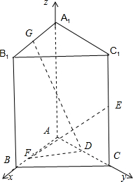 分析 建立直角坐标系,以A为坐标原点,AB为x轴,AC为y轴,AA1为z轴,可得F(t1,0,0)(0<t1<1),E(0,1,$\frac{1}{2}$),G($\frac{1}{2}$,0,1),D(0,t2,0)(0<t2<1).可得$\overrightarrow{EF}$=(t1,-1,-$\frac{1}{2}$),$\overrightarrow{GD}$=(-$\frac{1}{2}$,t2,-1),利用GD⊥EF,由此推出 0<t2<$\frac{1}{2}$.再利用向量的模的计算公式和二次函数的单调性即可得出.