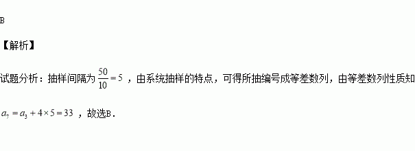 某班级有50名学生,现用系统抽样的方法从这50名学生中抽出10名学生,将这50名学生随机编号为1~50号,并按编号顺序平均分成10组(1~5号,6~10号,…,46~50号),若在第三组抽到的编号是13,则在第七组抽到的编号是( )
