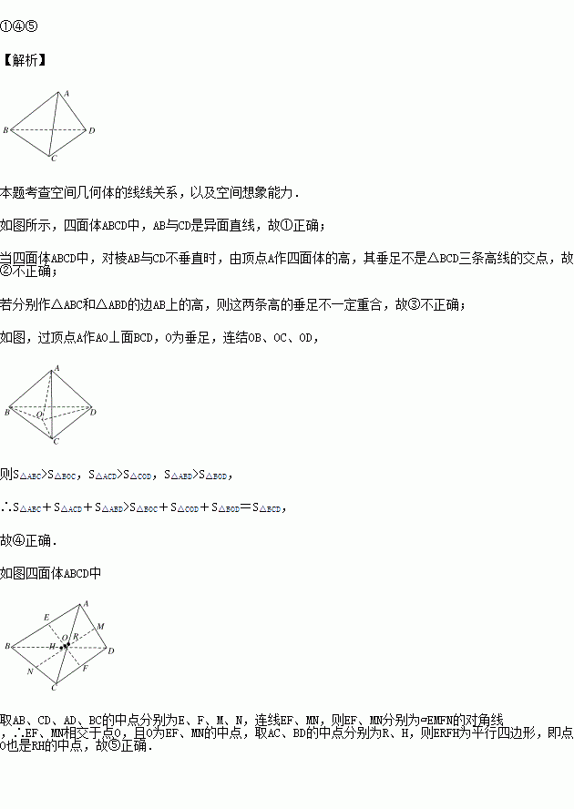 ⑤分别作三组相对棱中点的连线,所得的三条线段相交于一点.
