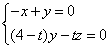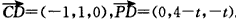 | (Ⅱ)解:以A为坐标原点,建立空间直角坐标系A-xyz(如图), 在平面ABCD内,作CE∥AB交AD于点E,则CE⊥AD, 在Rt△CDE中,DE=CD·cos45°=1,CE=CD·sin45°=1, 设AB=AP=t,则B(t,0,0),P(0,0,t), 由AB+AD=4得AD=4-t, 所以E(0,3-t,0),C(1,3-t,0),D(0,4-t,0), (i)设平面PCD的法向量为n=(x,y,z), 由 取x=t,得平面PCD的一个法向量n=(t,t,4-t), 又 故由直线PB与平面PCD所成的角为30°得 即 AD=4-t>0), 所以 (ii)假设在线段AD上存在一点G,使得点G到点P,B,C,D的距离都相等. 设G(0,m,0)(其中0≤m≤4-t), 则 由 由 由(1)、(2)消去t,化简得m2-3m+4=0, (3) 由于方程(3)没有实数根,所以在线段AD上不存在一个点G, 使得点G到点P,C,D的距离都相等. 从而,在线段AD上不存在一个点G, 使得点G到点P,B,C,D的距离都相等. |