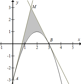 (2)S=S△ABM-${∫}_{0}^{3}[(-{x}^{2}+4x-3)-(x-3)]dx$=$\frac{27}{4}$-$\frac{9}{2}$=$\frac{9}{4}$,