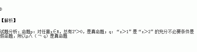 已知命题p:对任意x∈R,总有2x>0;q:“x>1”是“x>2”的充分不必要条件,则下列命题为真命题的是( )