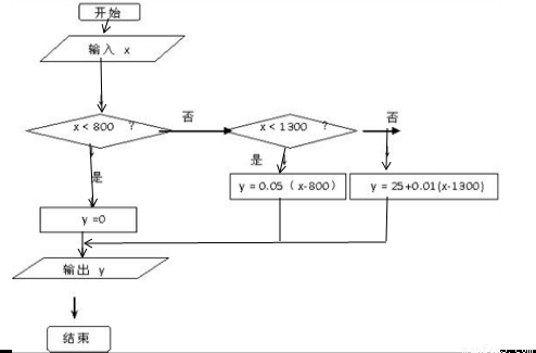 第二步 如果x<=800,那么y=0;如果800<x<=1300,那么 y=0.05(x-800);否则 y=25+0.1(x-1300)