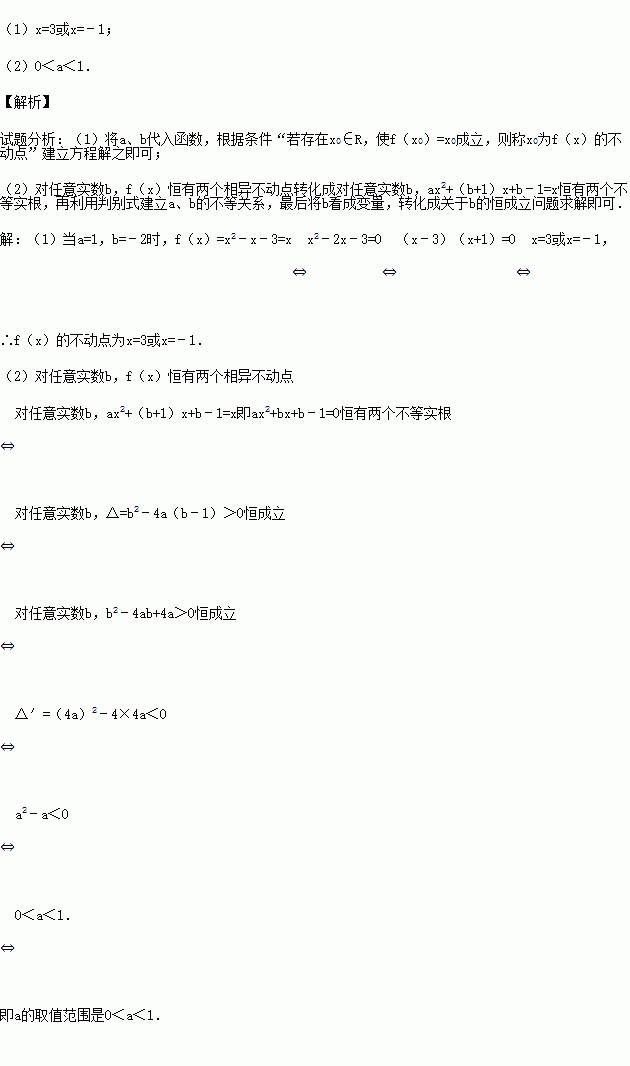 (2)若对于任意实数b,函数f(x)恒有两个相异的不动点,求a的取值范围.