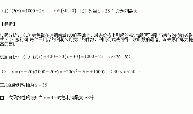 (本题满分8分)某商店购进一批单价为20元的日用品,如果以单价30元销售,那么可卖出400件,如果每提高单价1元,那么销售量Q(件)会减少20,设每件商品售价为