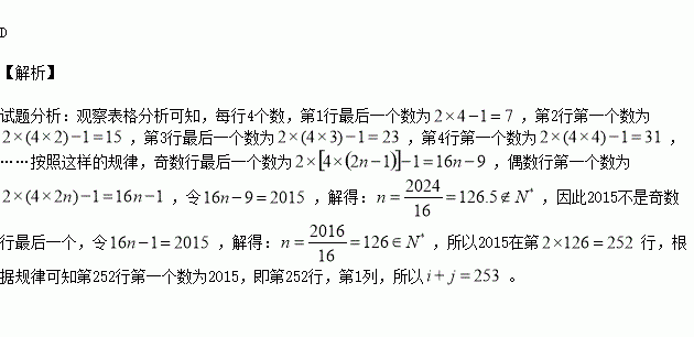 将正奇数1,3,5,7,…按右表的方式进行排列,记aij表示第i行第j列的数,若aij=2015则i+j的值为( )