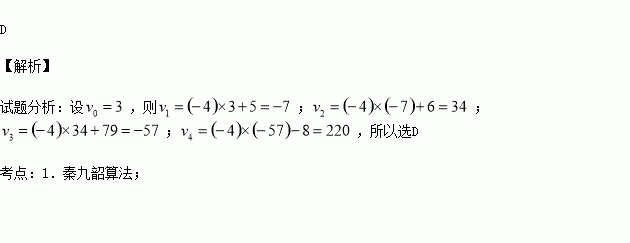 用秦九韶算法求多项式f(x)=12+35x-8x2+79x3+6x4+5x5+3x6的值,当x=-4时,v4的值为( )