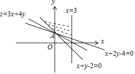 由图可知,当直线y=$-\frac{3}{4}x+\frac{z}{4}$过A时,直线在y轴上的截距最小,z有最小值为8.