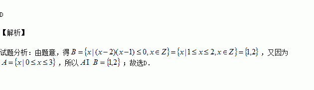 设集合A={x|0≤x≤3},B={x|x2-3x+2≤0,x∈Z},则A∩B等于 ( )