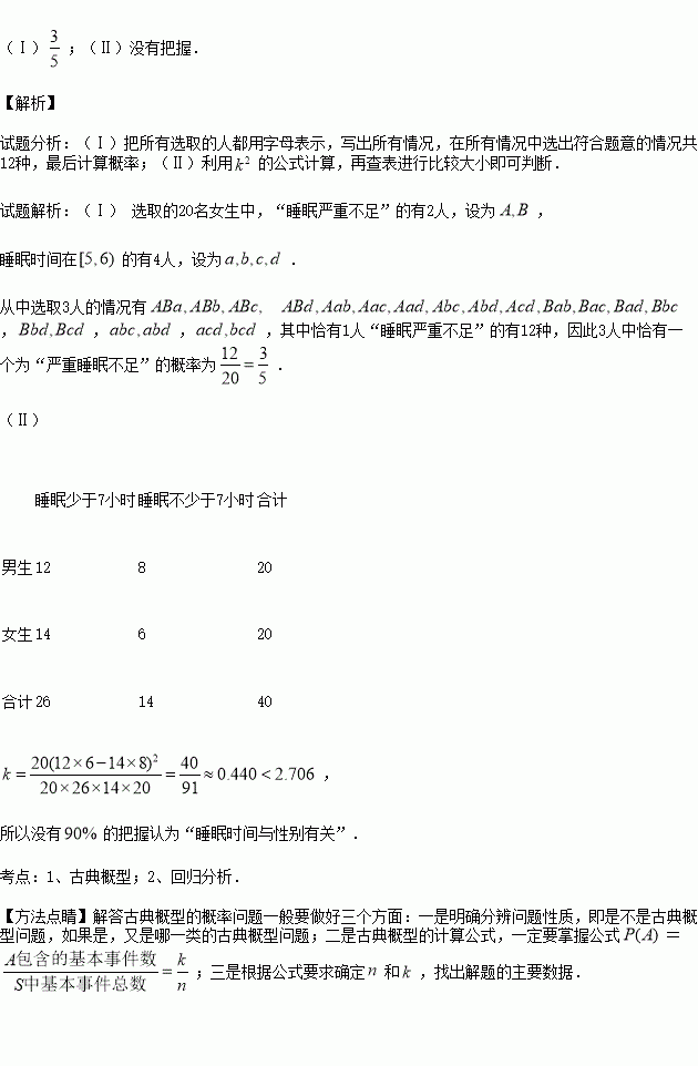 (1)现把睡眠时间不足5小时的定义为“严重睡眠不足”,从睡眠时间不足6小时的女生中随机抽取3人,求此3人中恰有一人为“严重睡眠不足”的概率;