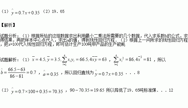 (2)已知该厂技术改造前100吨甲产品能耗为90吨标准煤.试根据(1)求出的线性回归方程,预测生产100吨甲产品的生产能耗比技术改造前降低多少吨标准煤?