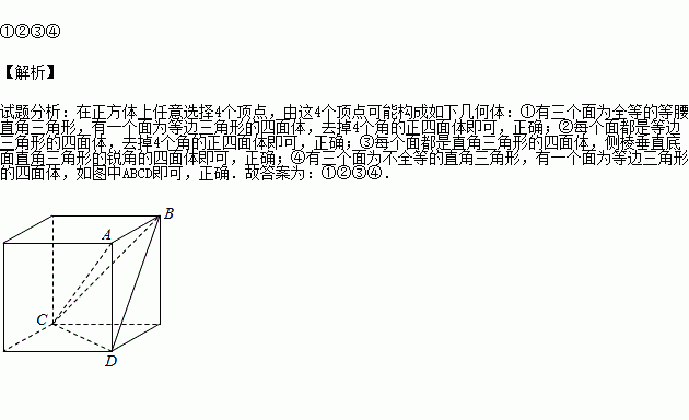 在正方体上任意选择4个顶点,由这4个顶点可能构成如下几何体: