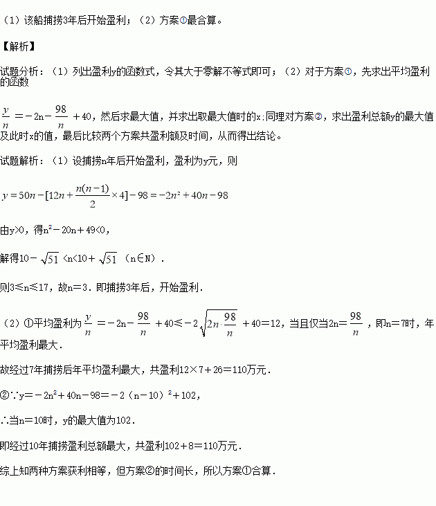 某渔业公司今年初用98万元购进一艘渔船用于捕捞,第一年需各种费用12万元,从第二年开始包括维修费在内,每年所需费用均比上一年增加4万元,该船每年捕捞的总收入为50万元.