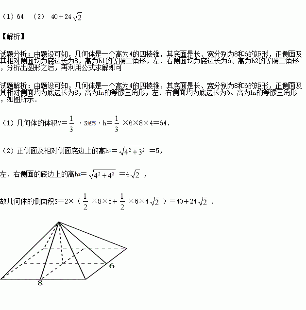 (本题满分10分)已知某几何体的俯视图是如图所示的矩形,主视图(或称正视图)是一个底边长为8,高为4的等腰三角形,侧视图(或称左视图)是一个底边长为6,高为4的等腰三角形.