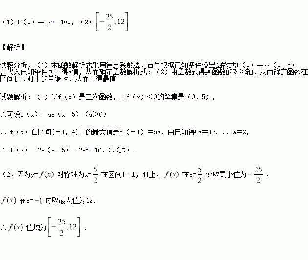 已知f(x)是二次函数,不等式f(x)<0的解集是(0,5) ,且f(x)在区间[-1,4]上的最大值是12.