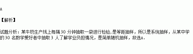 某牛奶生产线上每隔30分钟抽取一袋进行检验,该抽样方法记为①;从某中学的30名数学爱好者中抽取3人了解学业负担情况,该抽样方法记为②.那么( )