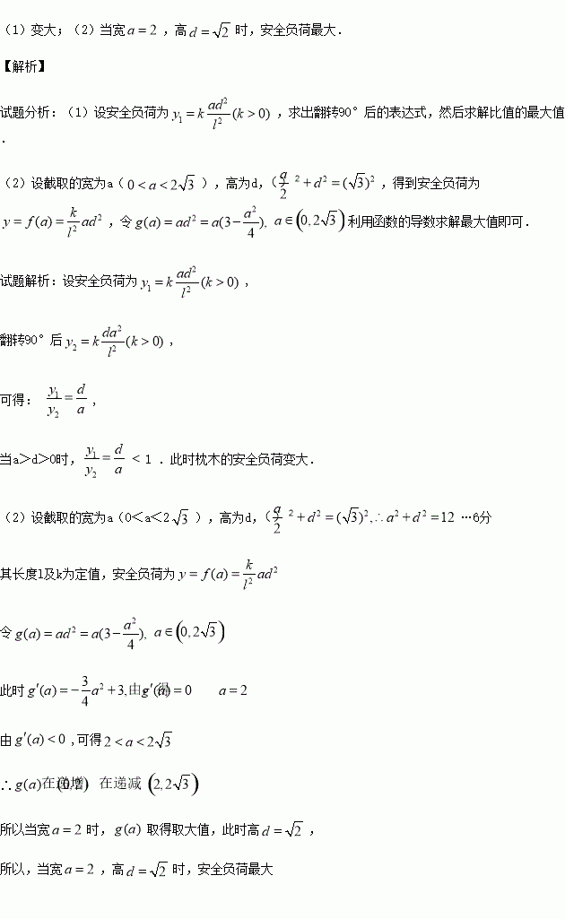 £¨±¾Ð¡ÌâÂú·Ö12·Ö£©ÈçͼËùʾ£¬Ò»¸ùˮƽ·ÅÖõij¤·½ÌåÕíľµÄ°²È«¸ººÉÓëËüµÄºñ¶ÈdµÄƽ·½ºÍ¿í¶ÈaµÄ³Ë»ý³ÉÕý±È£¬Í¬Ê±ÓëËüµÄ³¤¶È
