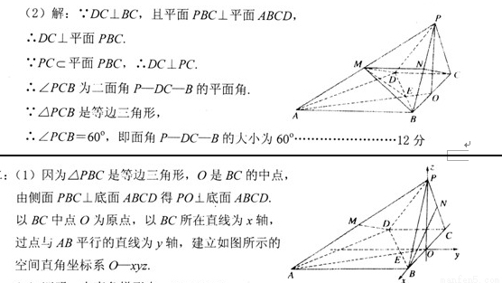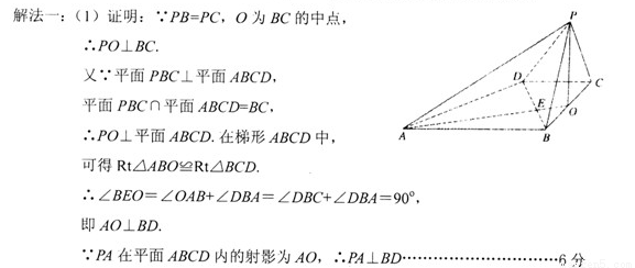 如图,已知四棱锥P—ABCD的底面是直角梯形,∠ABC=∠BCD =90o,AB=BC=PB=PC=2CD=2,侧面PBC⊥底面ABCD,O是BC的中点,AO交BD于E.