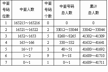 解:按4170万股票,每人1000股计算.共可有41700人可购买股票. 由于中签率r= 所以摇出的中签号码至少是2位数(否则中签人数超过41700). 当中签号码是某个二位数时,中签人数为16521人或16522人(当这个二位数a≤58时,有16522人中签,当a>58时,有16521人中签).又由于 当中签号码是某个三位数时,中签人数为1652个或1653个,又由于 以此类推,顺次得到不同位数的中签号码和中签人数.